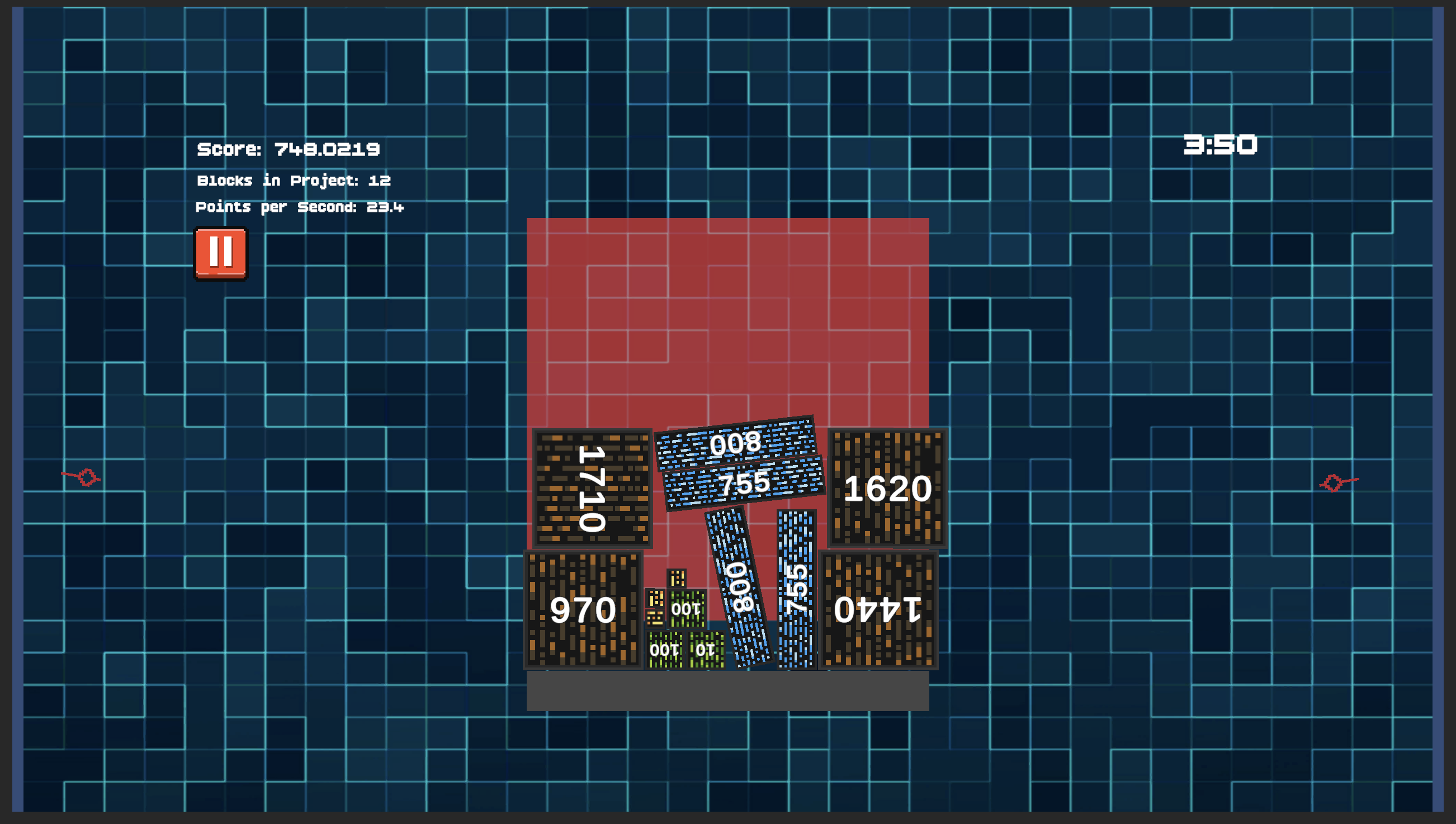 TECH_STACK is a game where random Tech Blocks will fall into your project. It's your job to keep them in your project (the big red square), lest they fall out of scope. The more Blocks you keep in your project, the more points you'll score over time. The goal is to beat your own highscore or a friends highscore with the best tower. You have 5 mins per try to improve your next tower and protect them from hits (red arrows) and explosions! (black arrows). May the best towers begin!